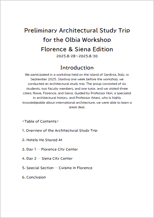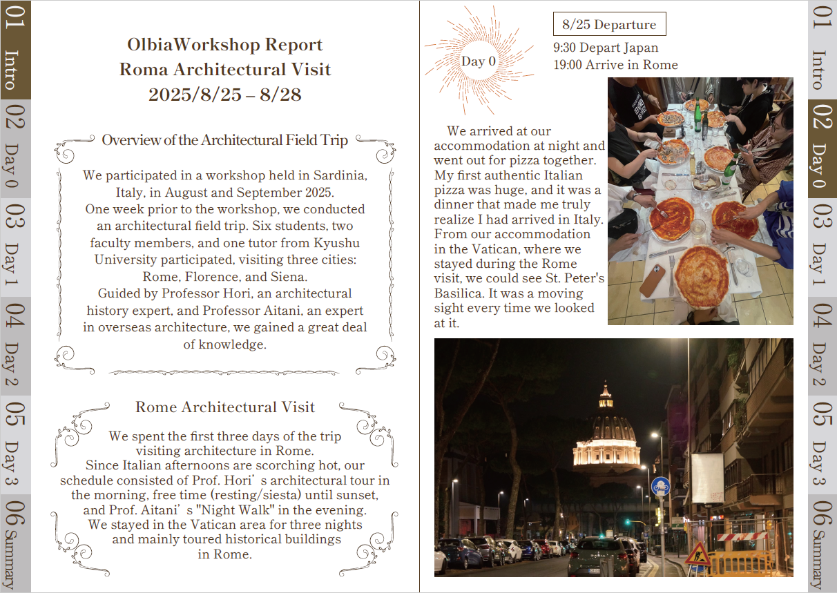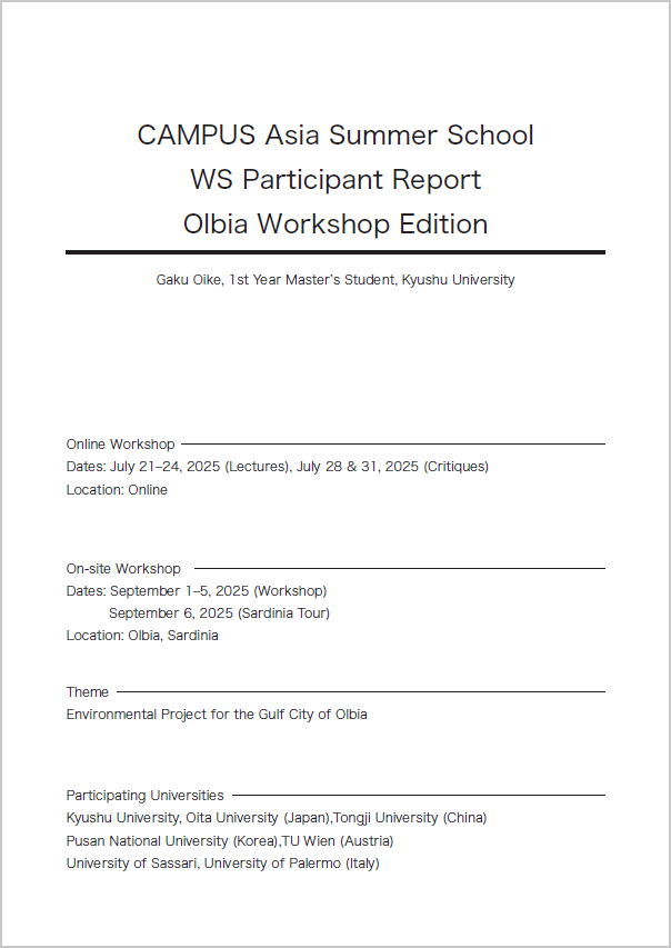 CAMPUS Asia Program_Summer School Workshop 2025 was held at Olbia in Sardinia, Italy, this year. First, an online lecture was held from July 21 to 31, then we moved to Olbia and participated in the on-site workshop from August 31 to September 6, 2025. Before the workshop, the party of Kyushu University did the architectural field trip to Rome and Florence from August 26 to 29.
