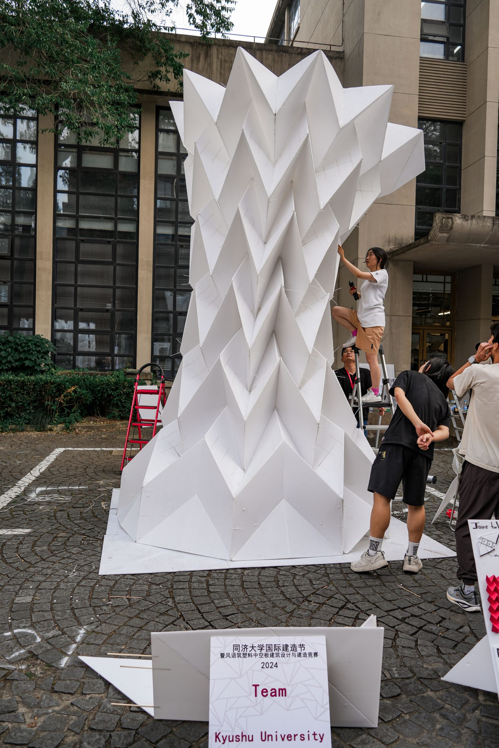 The concept of Team Kyushu University was a sound kaleidoscope. They completed to construct the tower, which is made in reference to the structure of origami, is covered with a number of folds.